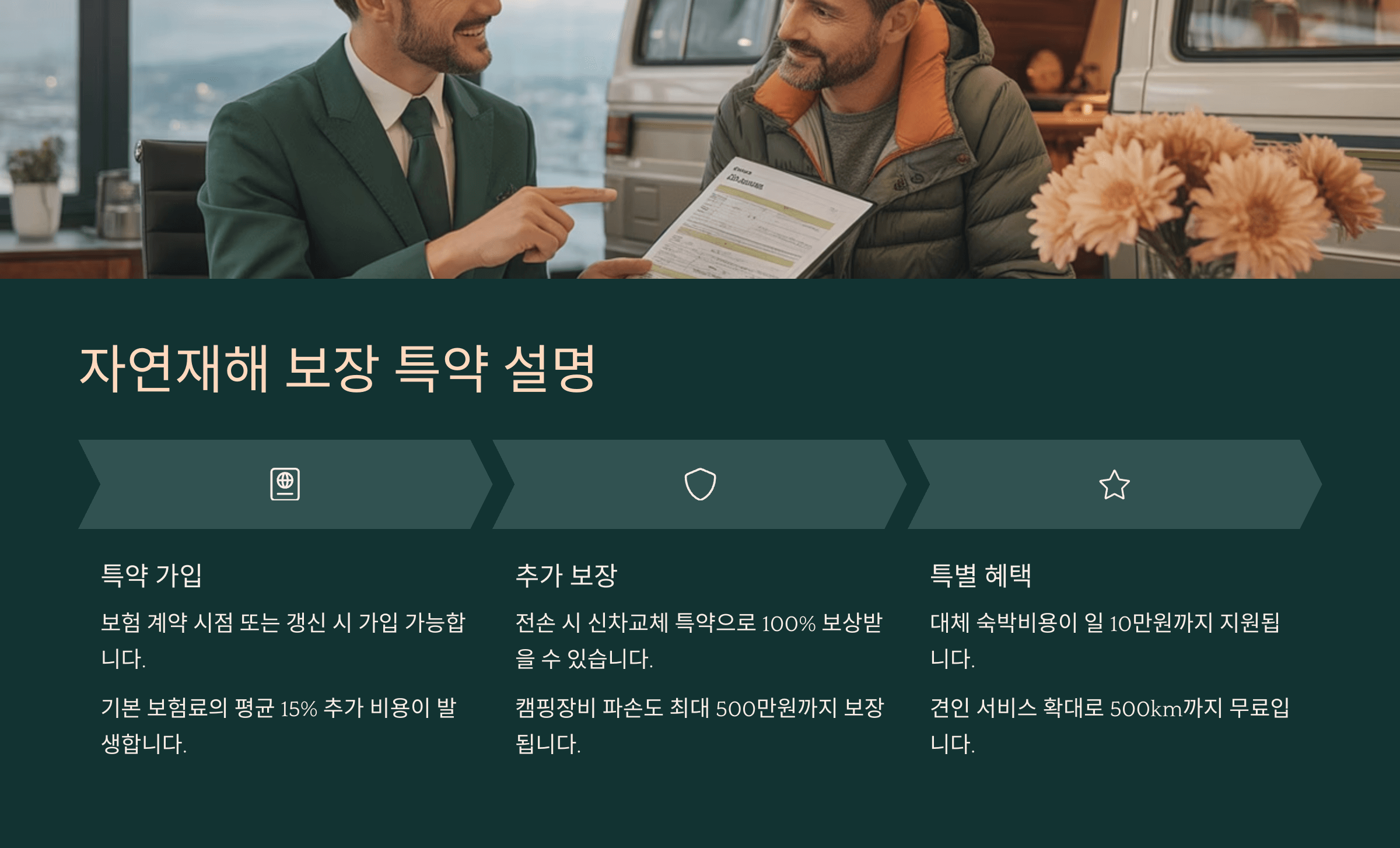 ๋‚ด๊ฐ€ ์ƒ๊ฐํ–ˆ์„ ๋•Œ ์บ ํ•‘์นด ๋ณดํ—˜์—์„œ ์ž์—ฐ์žฌํ•ด ๋ณด์žฅ์€ ํŠนํžˆ ์žฅ๊ฑฐ๋ฆฌ ์—ฌํ–‰์ž๋‚˜ ์‚ฐ์•…ยทํ•ด์•ˆ ์ง€์—ญ ์—ฌํ–‰์ž์—๊ฒŒ ํ•„์ˆ˜์˜ˆ์š”. ๋ฏธ๋ฆฌ ๋Œ€๋น„ํ•˜๋ฉด ๋งˆ์Œ ํŽธํžˆ ์—ฌํ–‰์„ ์ฆ๊ธธ ์ˆ˜ ์žˆ์–ด์š”.