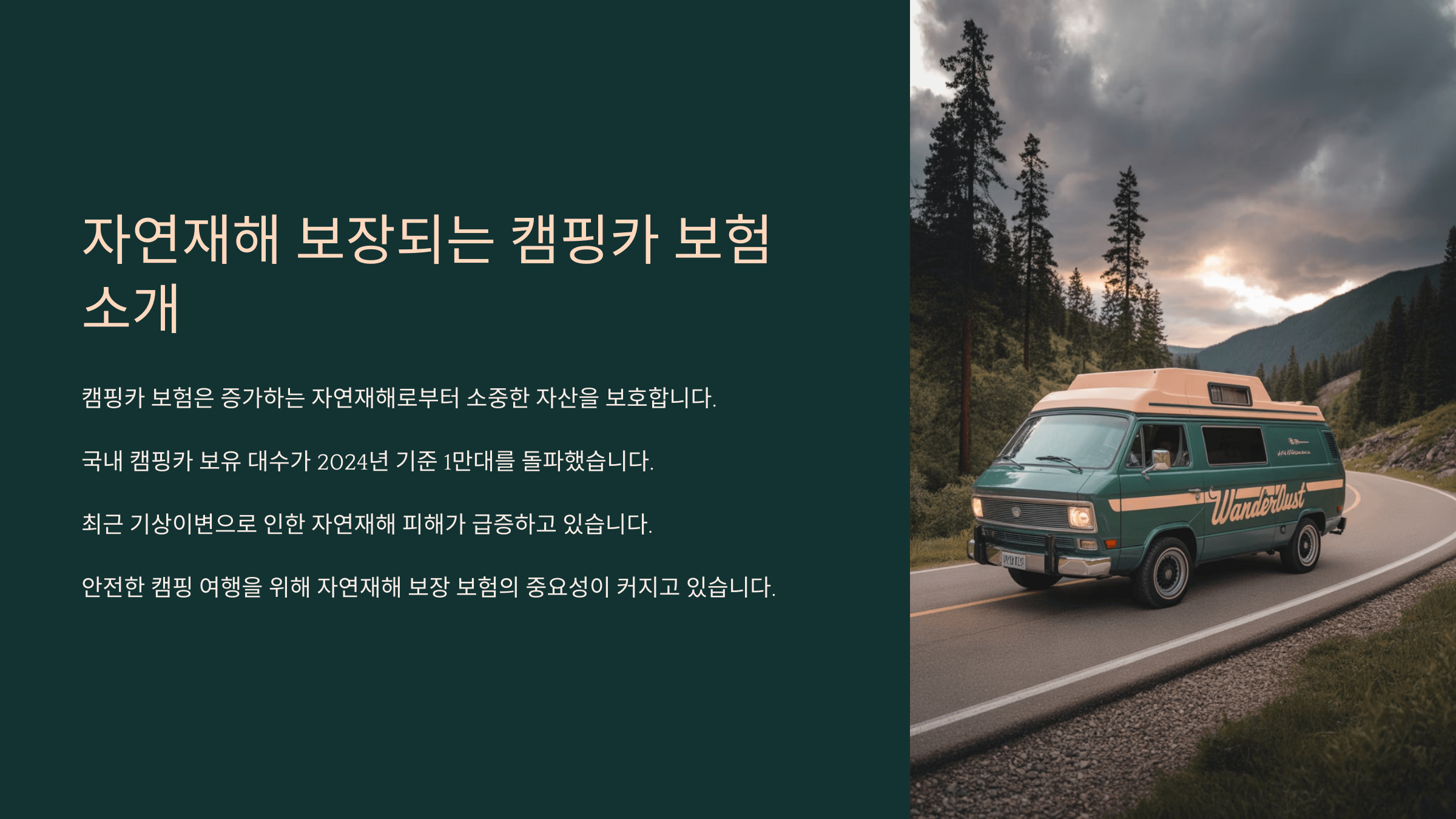 ์บ ํ•‘์นด๋Š” ์ž์œ ๋กœ์šด ์—ฌํ–‰์˜ ์ƒ์ง•์ด์ง€๋งŒ, ์ž์—ฐ์žฌํ•ด ์•ž์—์„œ๋Š” ์˜ˆ์™ธ๊ฐ€ ์•„๋‹ˆ์—์š”. ์บ ํ•‘์นด ๋ณดํ—˜์— ์ž์—ฐ์žฌํ•ด ๋ณด์žฅ์ด ํฌํ•จ๋˜์–ด ์žˆ์œผ๋ฉด ๋งˆ์Œ ๋†“๊ณ  ์—ฌํ–‰ํ•  ์ˆ˜ ์žˆ๋‹ต๋‹ˆ๋‹ค. ํŠนํžˆ ์š”์ฆ˜์ฒ˜๋Ÿผ ๊ธฐํ›„ ๋ณ€ํ™”๊ฐ€ ์‹ฌ๊ฐํ•ด์ง€๋Š” 2025๋…„์—๋Š” ๋”๋”์šฑ ํ•„์š”ํ•˜๋‹ค๊ณ  ์ƒ๊ฐํ•ด์š”.