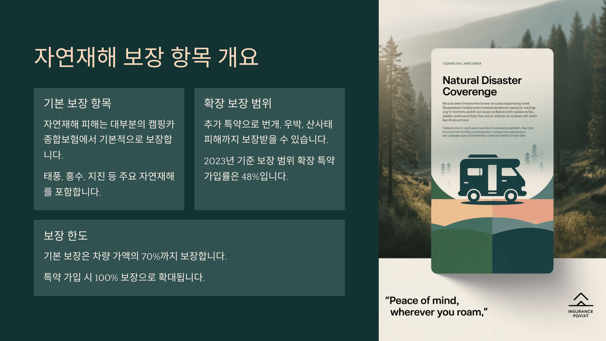 ์ด๋ฒˆ ๊ธ€์—์„œ๋Š” ์ž์—ฐ์žฌํ•ด๊ฐ€ ์บ ํ•‘์นด ๋ณดํ—˜์—์„œ ์–ด๋–ป๊ฒŒ ๋ณด์žฅ๋˜๋Š”์ง€, ์–ด๋–ค ํ•ญ๋ชฉ์ด ํฌํ•จ๋˜๊ณ  ํ”ผํ•ด๊ฐ€ ๋ฐœ์ƒํ•˜๋ฉด ์–ด๋–ป๊ฒŒ ์ฒ˜๋ฆฌํ•˜๋Š”์ง€, ๊ทธ๋ฆฌ๊ณ  ํŠน์•ฝ๊ณผ ์ฃผํ–‰ ์‹œ ์ฃผ์˜ํ•  ์ ๊นŒ์ง€ ๊ผผ๊ผผํžˆ ์‚ดํŽด๋ณผ ๊ฑฐ์˜ˆ์š”.
