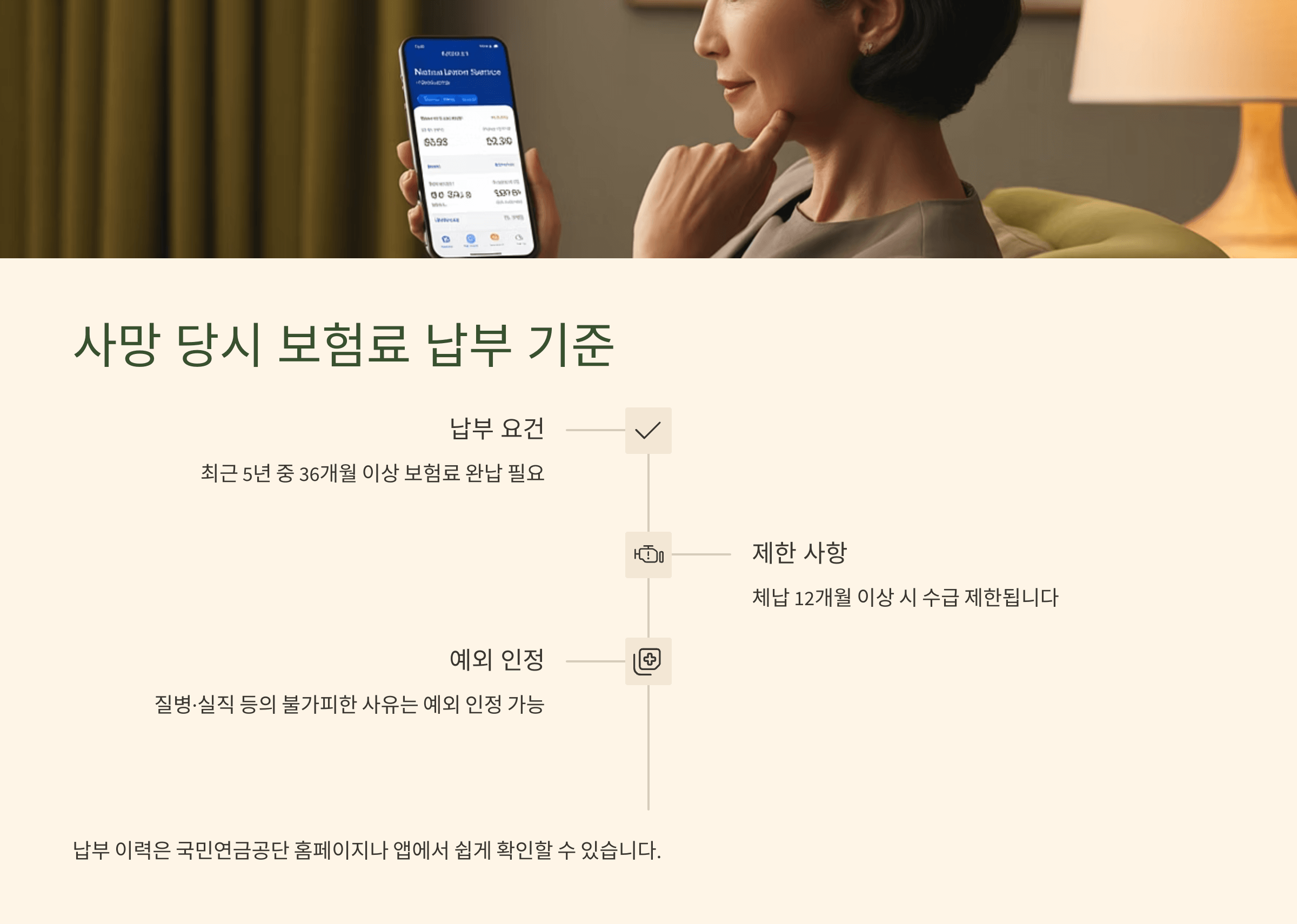 ๋ณดํ๋ฃ ๋ฉ๋ถ ๊ธฐ์ค์ ์ ์กฑ์ฐ๊ธ์ ๋ฐ์ ์ ์๋ ํต์ฌ ์กฐ๊ฑด ์ค ํ๋์์. ํนํ ๊ฐ์ ์๊ฐ ์ฐ๊ธ์ ๋ฐ์ง ๋ชปํ ์ฑ ์ฌ๋งํ ๊ฒฝ์ฐ์๋ ์ด ์กฐ๊ฑด์ด ๋์ฑ ์ค์ํ๋ต๋๋ค. ๊ตญ๋ฏผ์ฐ๊ธ๊ณต๋จ์์๋ ์ฌ๋ง ๋น์๊น์ง โ60๊ฐ์ ์ด์ ๋ณดํ๋ฃ๋ฅผ ๋ฉ๋ถํ๋์งโ๋ฅผ ๊ธฐ์ค์ผ๋ก ํ๋จํด์.