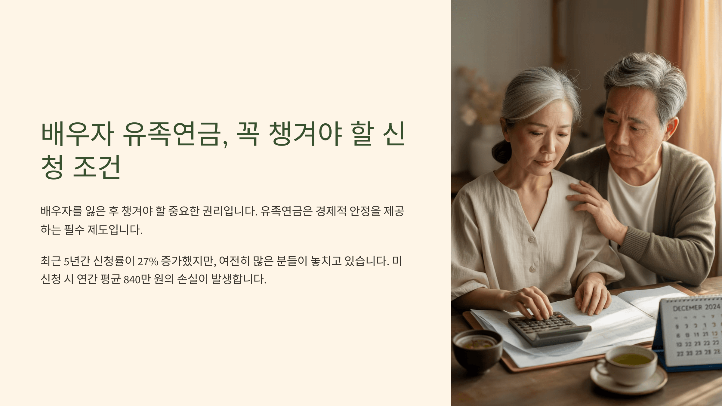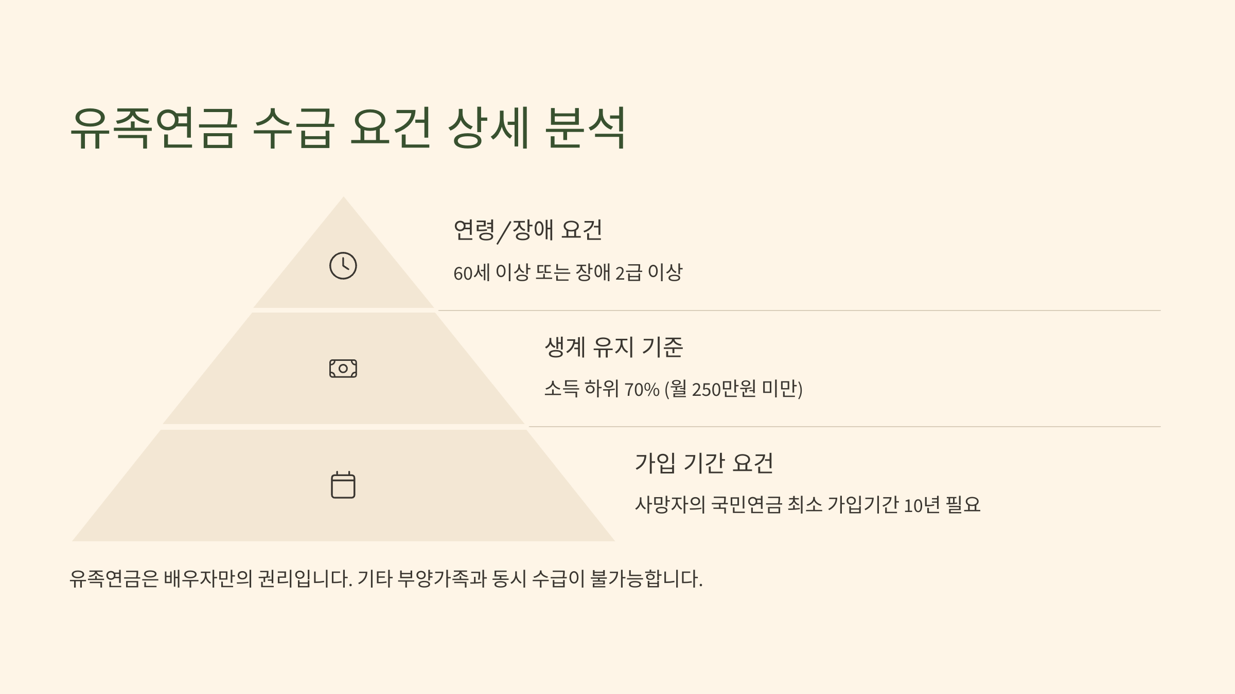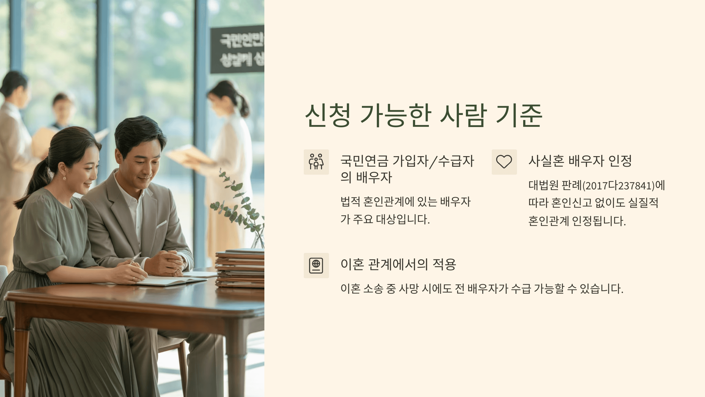 ๋ ๋ฒ์งธ๋ โ์๊ธ๊ถ์ ์ฌ๋งโ์ด์์. ์ด๋ฏธ ๊ตญ๋ฏผ์ฐ๊ธ์ ๋ฐ๊ณ ์๋ ์ฌ๋์ด ์ฌ๋งํ์ ๋๋ ์ ์กฑ์ฐ๊ธ์ด ๊ฐ๋ฅํด์. ์ด ๊ฒฝ์ฐ์๋ ์ฐ๊ธ ์๋ น ์ค์ด๋ผ๋ ์ ์์ฒด๊ฐ ๋ณดํ๋ฃ ๋ฉ๋ถ ์๊ฑด์ ์ถฉ์กฑํ๋ค๋ ๋ป์ด๊ธฐ ๋๋ฌธ์ ์ถ๊ฐ๋ก ๋ณดํ๋ฃ ๋ฉ๋ถ ์ด๋ ฅ์ ํ์ธํ์ง ์์์. ๊ทธ๋์ ๋ ธ๋ น์ฐ๊ธ์ ๋ฐ๊ณ ์๋ ์ฌ๋์ด ์ฌ๋งํ๋ค๋ฉด ๋ฐฐ์ฐ์ ๋ฑ ์ ์กฑ์ด ์ ์กฑ์ฐ๊ธ์ ์ ์ฒญํ ์ ์์ด์.
