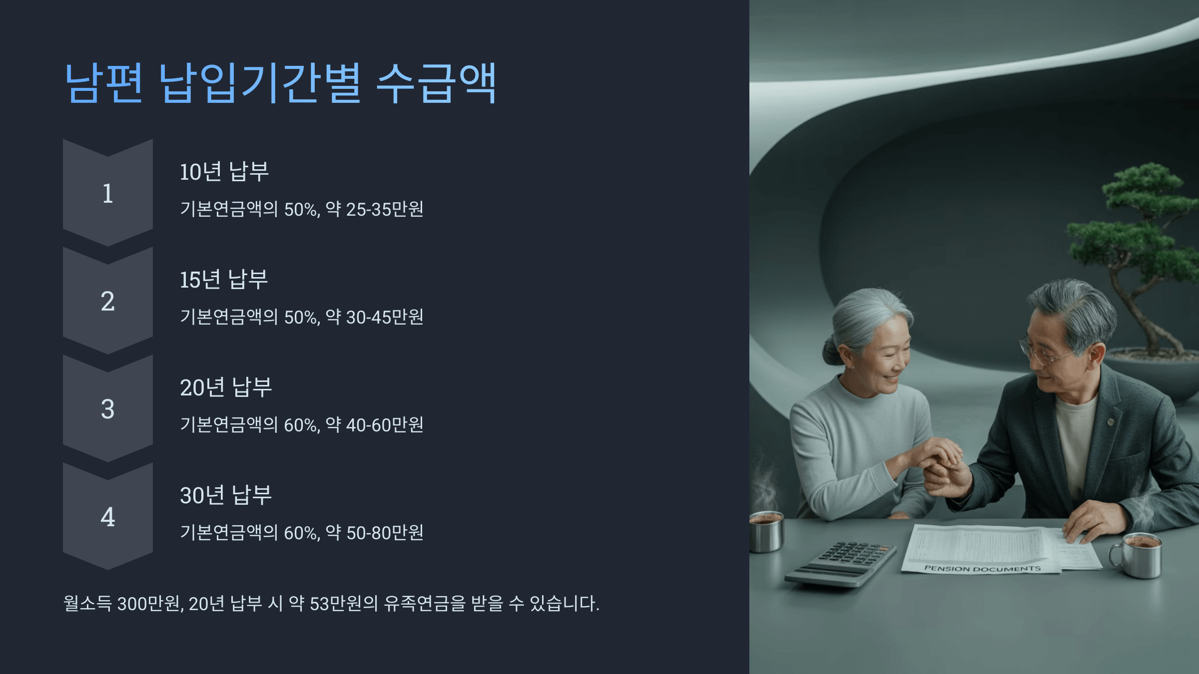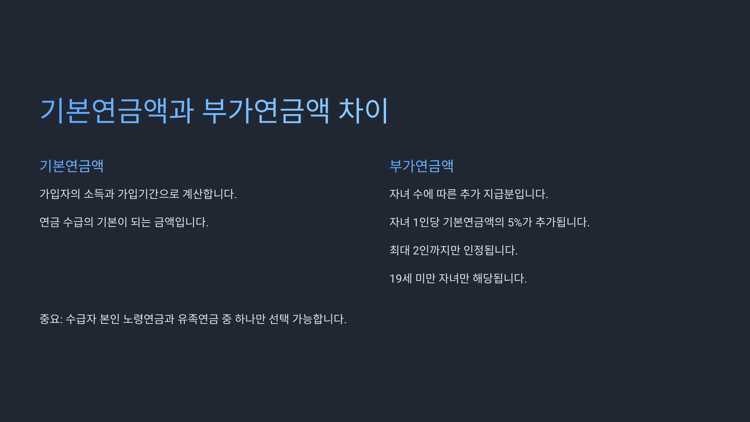 ์๋ฅผ ๋ค์ด, 60์ธ ์ด์์ ์๋ด๊ฐ ์๋ ์์ด ๋จ๋ ์๊ธ์ ํ๋ค๋ฉด ๋ถ๊ฐ์ฐ๊ธ ์์ด ๊ธฐ๋ณธ์ฐ๊ธ์ 60%๋ง ๋ฐ๊ฒ ๋ผ์. ๋ฐ๋ฉด, ๋ฏธ์ฑ๋ ์๋ ๊ฐ ์๋ค๋ฉด ์ถ๊ฐ ๊ธ์ก์ด ์๊ธธ ์ ์์ด์.