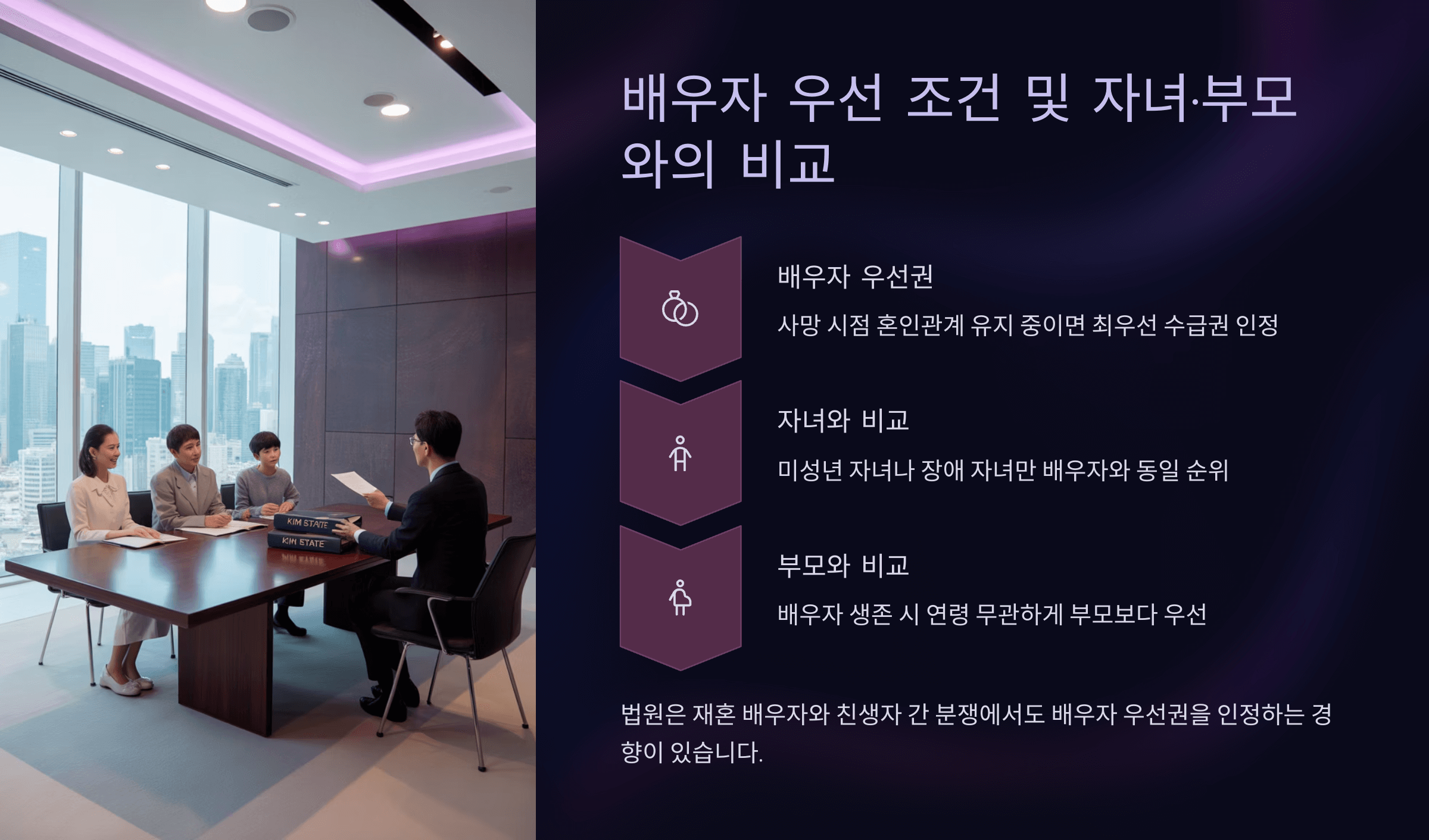 ์ด ์ค์์๋ ํนํ ๋ง์ด ๊ถ๊ธํดํ๋ ๋ถ๋ถ์ด ๋ฐ๋ก โ๋ฐฐ์ฐ์๊ฐ ์ ์กฑ์ฐ๊ธ์ ๊ผญ 1์์๋ก ๋ฐ๋ ๊ฑธ๊น?โ๋ผ๋ ์ ์ด์์. ์ค์ ๋ก ๋ฒ๋ฅ ๊ณผ ํ๋ก์ ๋ฐ๋ผ ๋ฐฐ์ฐ์๊ฐ ํญ์ ์ฐ์ ์ธ ๊ฒ์ ์๋๋ฉฐ, ์ํฉ์ ๋ฐ๋ผ ์๋ ๋ ๋ค๋ฅธ ๊ฐ์กฑ์ด ๋จผ์ ๋ฐ์ ์๋ ์์ด์. ํนํ ๋ฏธ์ฑ๋ ์๋ ๋ ์ฅ์ ์ธ ์๋ ๊ฐ ์๋ ๊ฒฝ์ฐ์๋ ๋ ๋ค๋ฅธ ๊ธฐ์ค์ด ์ ์ฉ๋๊ธฐ๋ ํด์.