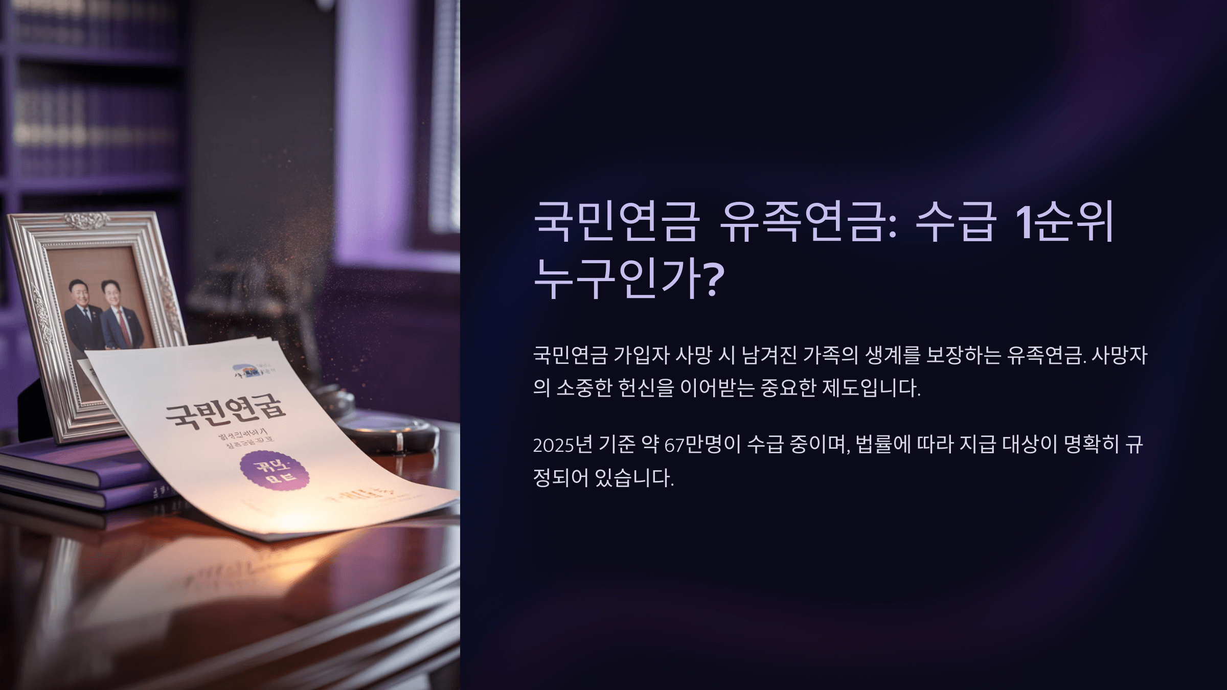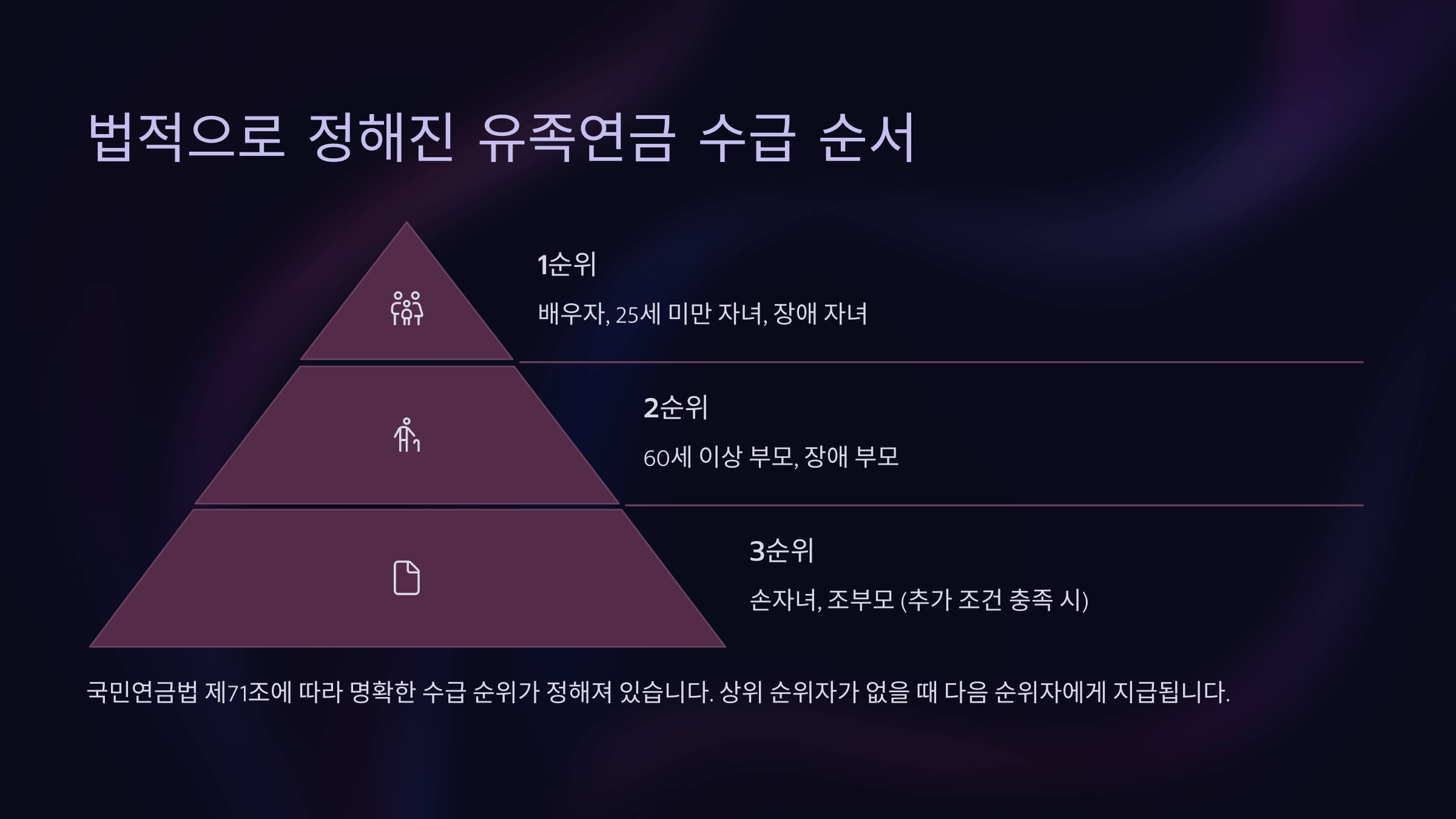 ๊ตญ๋ฏผ์ฐ๊ธ์ ๊ฐ์ ์๊ฐ ์ฌ๋งํ์ ๋ ๋จ๊ฒจ์ง ๊ฐ์กฑ๋ค์ด ๊ฒฝ์ ์ ์ผ๋ก ์ด๋ ค์ ์์ด ์ด์๊ฐ ์ ์๋๋ก ๋๊ธฐ ์ํ ์ ๋์์. ์ด๋ฐ ์ ์กฑ์ฐ๊ธ์ ๋๊ฐ ๋ฐ์ ์ ์์์ง์ ๋ฐ๋ผ ๊ฐ๋ฑ์ด ์๊ธธ ์ ์๊ธฐ ๋๋ฌธ์, ๋ฒ์ ์ผ๋ก ์๊ธ ์์๊ฐ ๋ช ํํ๊ฒ ์ ํด์ ธ ์์ด์. ๋ฐฐ์ฐ์, ์๋ , ๋ถ๋ชจ, ์์๋ , ์กฐ๋ถ๋ชจ๊น์ง ๋ค์ํ ๊ฐ์กฑ๋ค์ด ๋์์ด ๋ ์ ์๋ต๋๋ค.