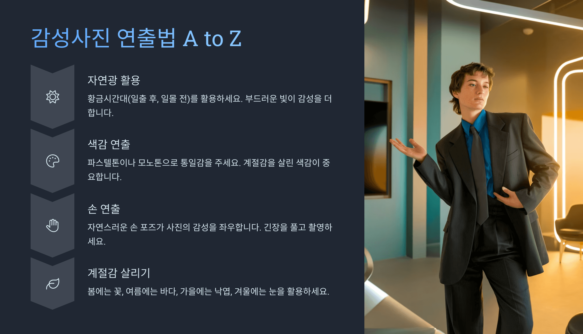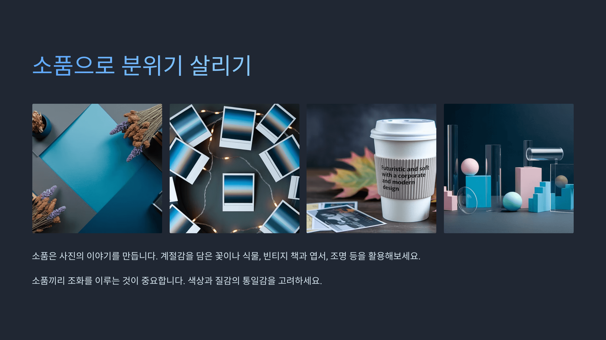 ์ฐ์ถ์ ์ํ๋ ค๋ฉด ๋จผ์ ์ดฌ์ํ๊ณ ์ ํ๋ ๊ฐ์ฑ์ ์ ํด์ผ ํด์. ๋ฐ๋ปํ๊ณ ํฌ๊ทผํ ๋๋์ ์ํ๋ค๋ฉด ๋ฎ์ ์ฑ๋์ ํฌ๋ฆผํค์ด๋ ๋ธ๋ผ์ด ๊ณ์ด ๋ฐฐ๊ฒฝ, ๋ฐ๋ปํ ์กฐ๋ช ์ ํ์ฉํ๋ฉด ์ข๊ณ ์. ์ฒญ๋ํ ๋ถ์๊ธฐ๋ฅผ ์ํ๋ค๋ฉด ํธ๋ฅธ ํ๋, ์์ฐ๊ด, ์ฐ๋ปํ ์๊ฐ์ ์ด๋ ค์ผ ํด์.