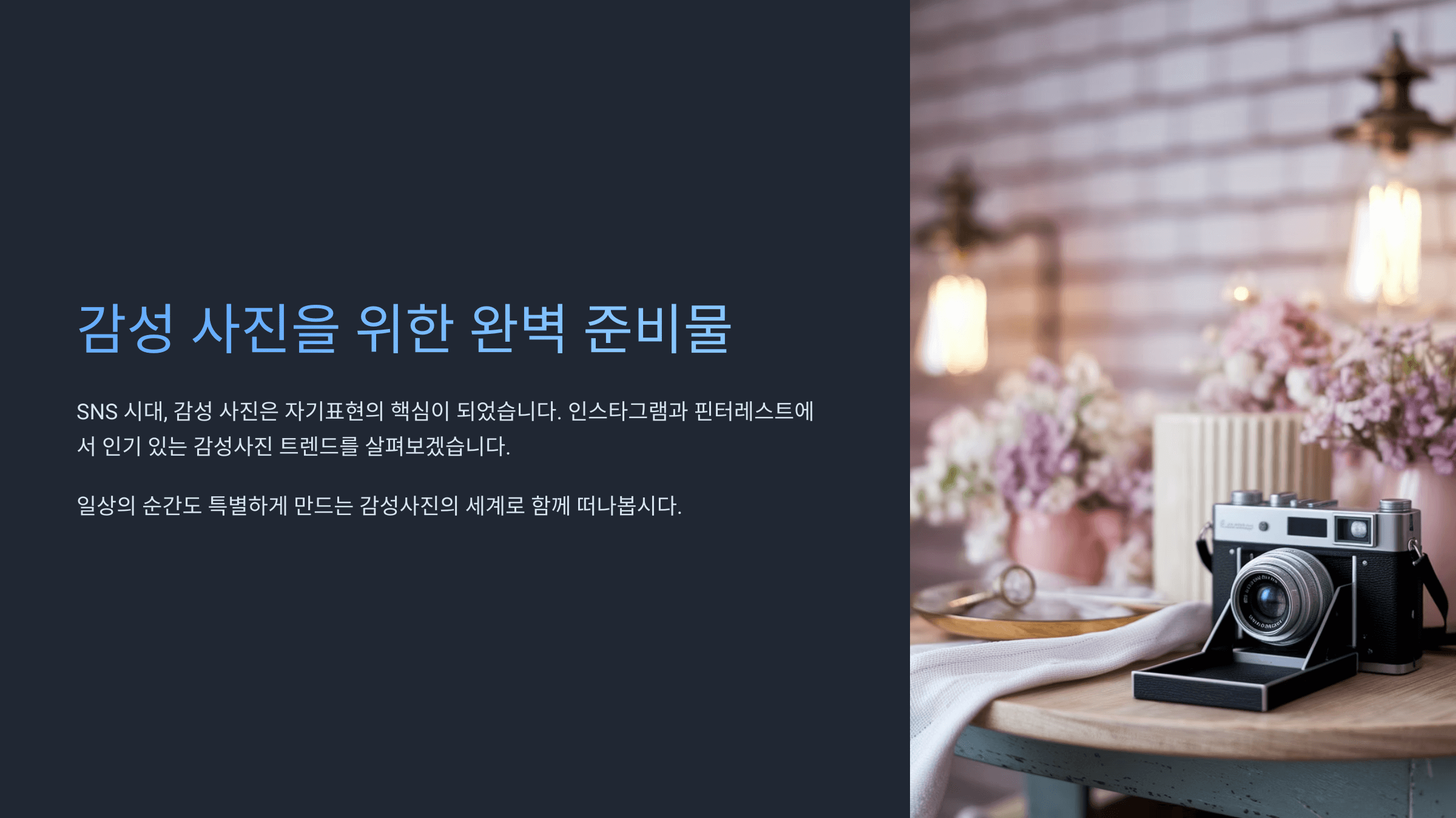 ์์ฆ์ ๊ฐ์ฑ ์ฌ์ง์ด ํ๋์ ๋ผ์ดํ์คํ์ผ์ฒ๋ผ ์ฌ๊ฒจ์ง๊ณ ์์ด์. ์ธ์คํ๊ทธ๋จ, ๋ธ๋ก๊ทธ, ์ ํ๋ธ๋ฅผ ๋น๋กฏํ SNS์์ ๋ง์ ์ฌ๋๋ค์ด ๋ฐ๋ปํ ์๊ฐ๊ณผ ์์ฐ์ค๋ฌ์ด ๋ถ์๊ธฐ์ ์ฌ์ง์ ๊ณต์ ํ๊ณ ์์ฃ . ๊ฐ์ฑ ์ฌ์ง์ ์ ์ฐ๊ธฐ ์ํด์ ๋จ์ํ ์์ ๋ฐฐ๊ฒฝ๋ง์ผ๋ก๋ ๋ถ์กฑํ๋ต๋๋ค.