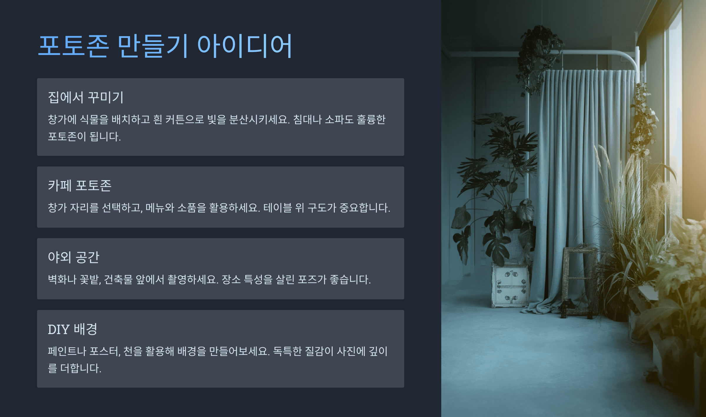 ํฌํ ์กด์ ๋ฐฐ๊ฒฝ๊ณผ ์กฐ๋ช ์ด ์ ์ผ ์ค์ํด์. ๋ฒฝ ํ ๋ฉด์ ๋ฐ๋ปํ ์กฐ๋ช ์ ๋ฌ๊ณ , ๊ฑด์กฐํ ๋๋ผ์ดํ๋ผ์๋ ๊ทธ๋ฆผ, ์บ๋ค, ํฌ์คํฐ ๋ฑ์ ๋ฐฐ์นํ๋ฉด ๊ณต๊ฐ์ด ํ ์ด์๋์. ํนํ ์ ๊ตฌ ์กฐ๋ช ์ด๋ ์กฐ๋ช ์ค์ ๊ฐ์ฑ ๋ถ์๊ธฐ ์ฐ์ถ์ ํ์ํ ์ด์์.