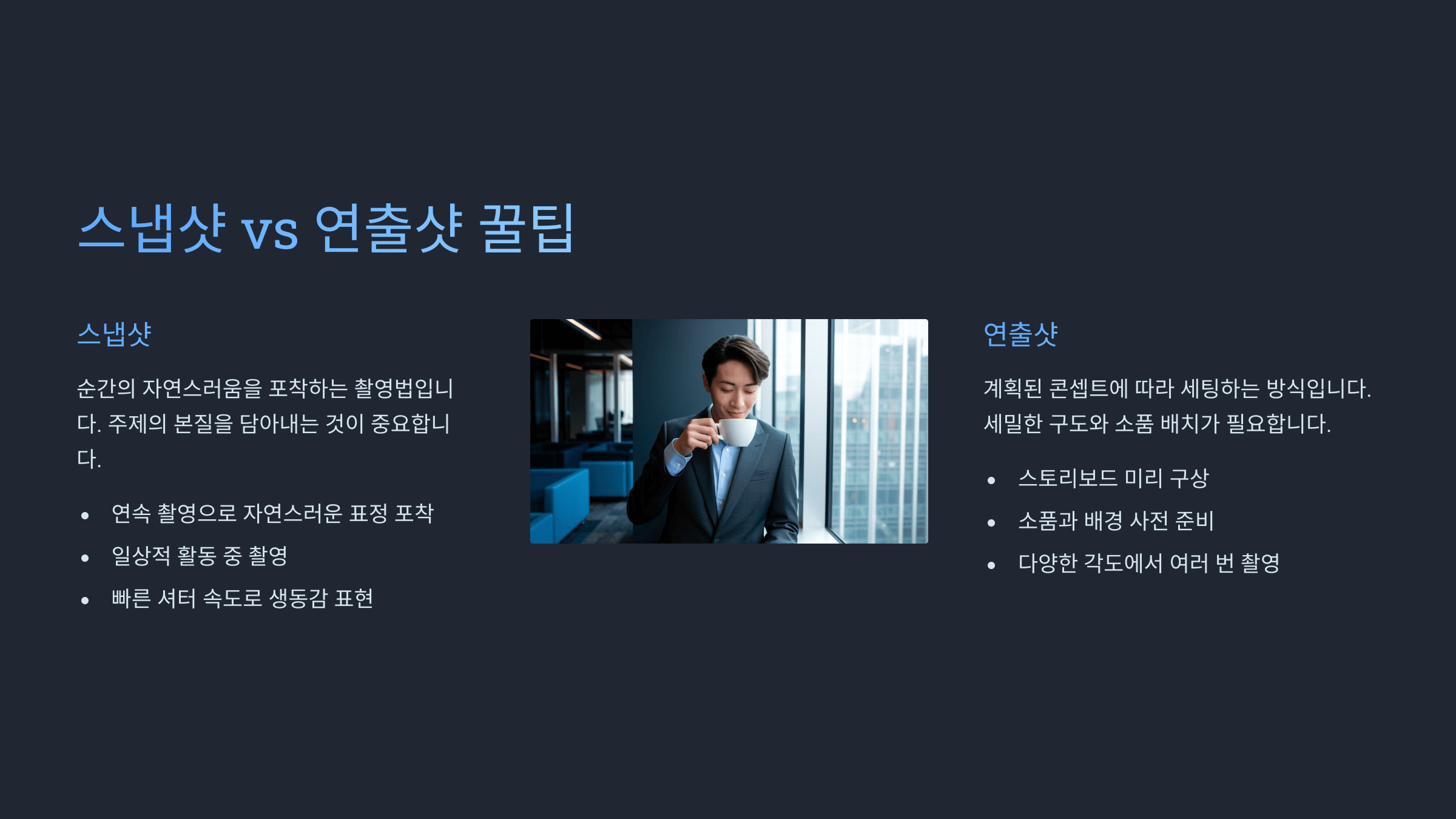 ๋ํ ์ดฌ์ ์ ์ฒดํฌ๋ฆฌ์คํธ๋ฅผ ๋ง๋ค์ด ๋์ผ๋ฉด ํธํด์. ๋ฐฐ๊ฒฝ, ์กฐ๋ช , ์ํ, ๋ ์จ, ํผ์ฌ์ฒด ๋ณต์ฅ๊น์ง ๋ฏธ๋ฆฌ ๊ณ ๋ คํด์ผ ์์ฑ๋ ๋์ ์ปท์ด ๋์์. ์ฌ์ ๊ณํ์ด ๊ฐ์ฑ์ ์ธ ๋๋์ ๊ฒฐ์ ์ง๋๋ค๊ณ ํด๋ ๊ณผ์ธ์ด ์๋์์!