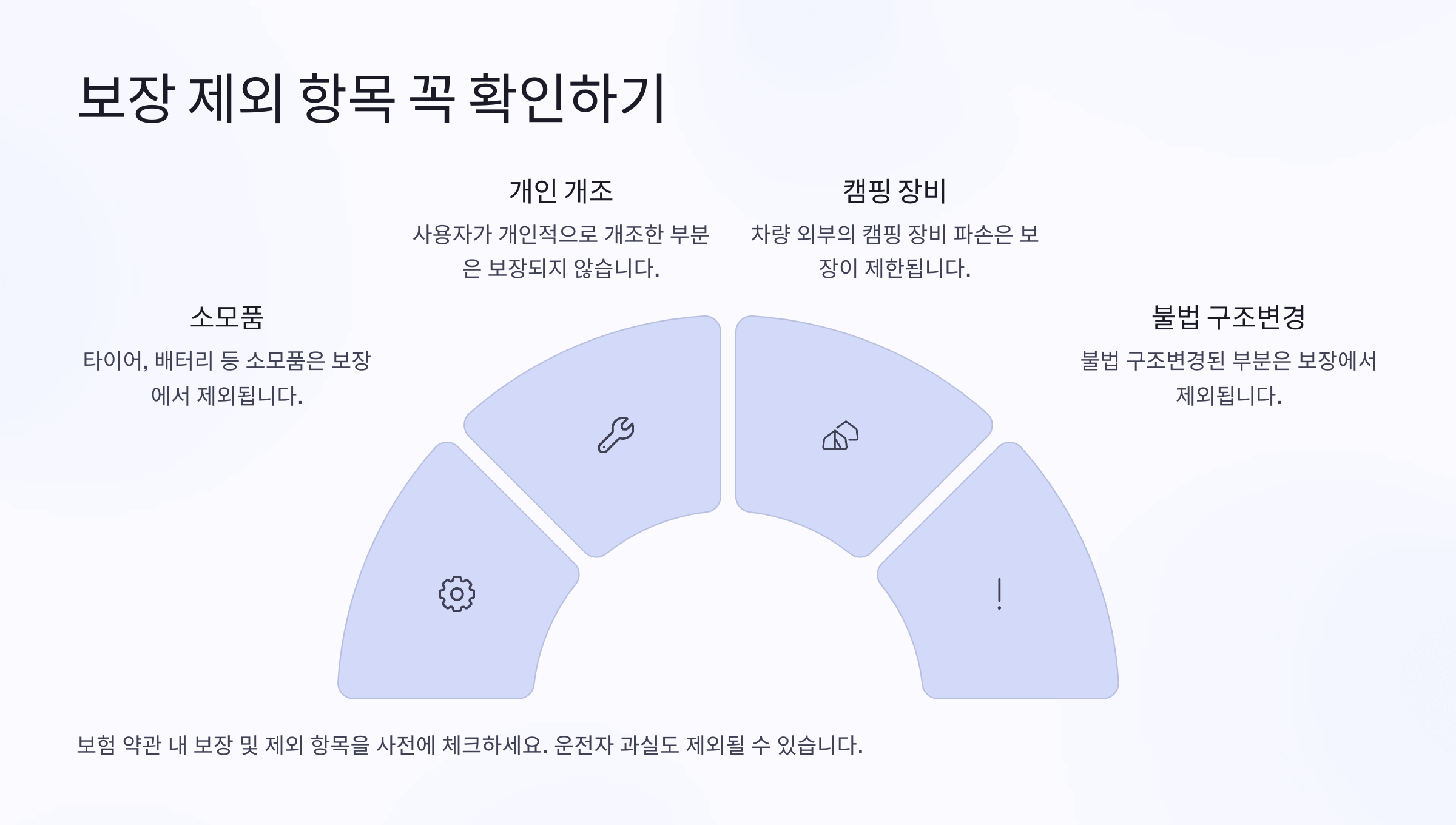 ๋ณดํ—˜์— ๊ฐ€์ž…ํ–ˆ๋‹ค๊ณ  ํ•ด์„œ ๋ชจ๋“  ์‚ฌ๊ณ ๊ฐ€ ๋‹ค ๋ณด์žฅ๋˜๋Š” ๊ฑด ์•„๋‹ˆ์—์š”. ๋ณดํ—˜ ์ƒํ’ˆ๋งˆ๋‹ค ‘๋ณด์žฅ ์ œ์™ธ ํ•ญ๋ชฉ’์ด ๋ช…ํ™•ํžˆ ์ •ํ•ด์ ธ ์žˆ์–ด์„œ ์ด ๋ถ€๋ถ„์„ ์ž˜ ๋ชจ๋ฅด๋ฉด ๋‚˜์ค‘์— ๋‚ญํŒจ๋ฅผ ๋ณผ ์ˆ˜ ์žˆ์–ด์š”. ํŠนํžˆ ์บ ํ•‘์นด๋Š” ํŠน์ˆ˜ ์ฐจ๋Ÿ‰์ด๋ผ ์ผ๋ฐ˜ ์ž๋™์ฐจ๋ณด๋‹ค ์ œ์™ธ ํ•ญ๋ชฉ์ด ๋งŽ์„ ์ˆ˜ ์žˆ์–ด์š”.