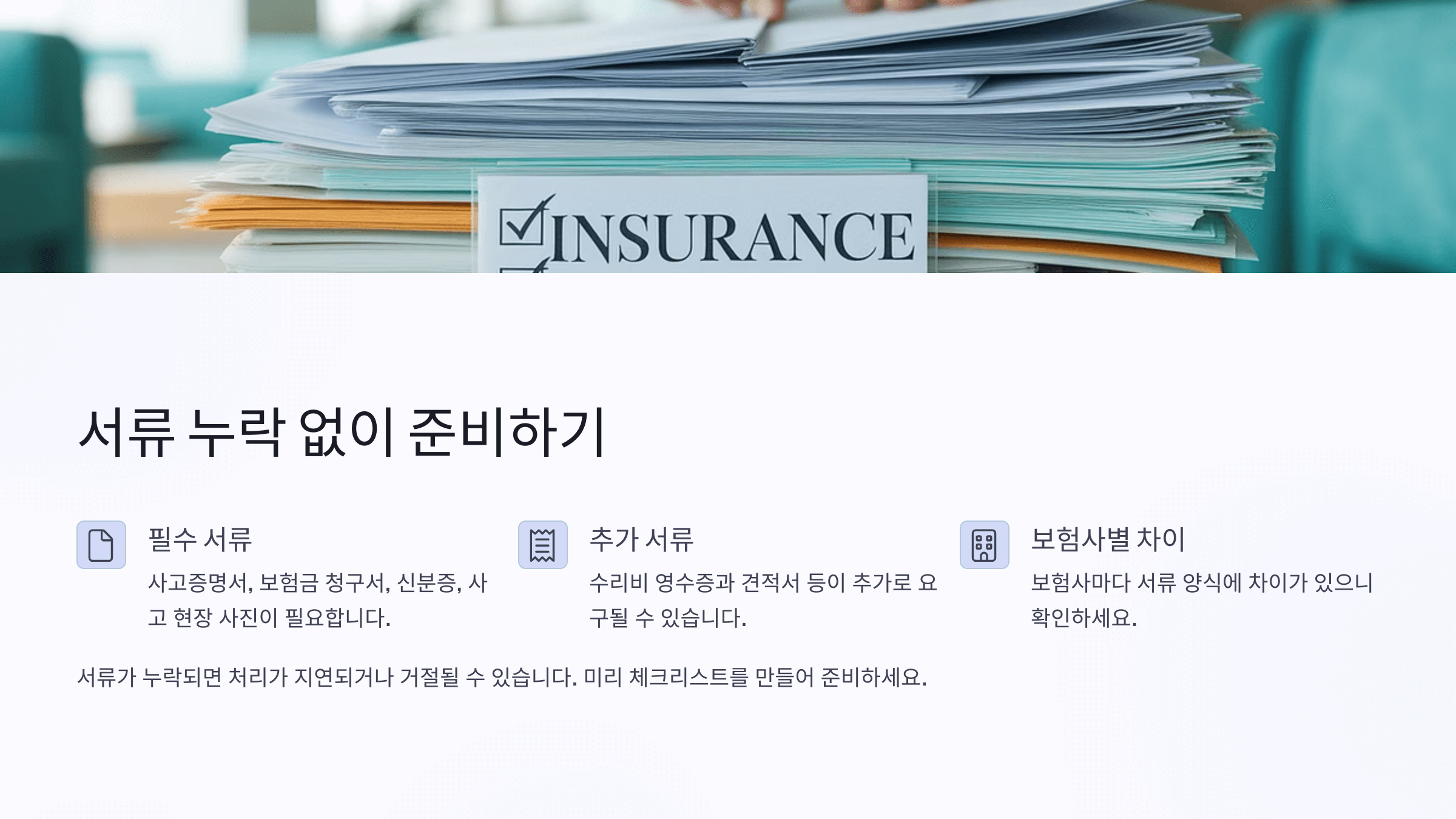 ๋‘ ๋ฒˆ์งธ๋Š” ‘์„œ๋ฅ˜ ๋ฏธ๋น„’. ์ง„๋‹จ์„œ, ์ˆ˜๋ฆฌ๊ฒฌ์ ์„œ, ๋ณ‘์›๋น„ ์˜์ˆ˜์ฆ, ์‚ฌ๊ณ  ๊ฒฝ์œ„์„œ ์ค‘ ํ•˜๋‚˜๋ผ๋„ ๋น ์ง€๋ฉด ์‹ฌ์‚ฌ ์ง€์—ฐ ๋˜๋Š” ๊ฑฐ์ ˆ์ด ๋  ์ˆ˜ ์žˆ์–ด์š”. ํ•„์ˆ˜ ์„œ๋ฅ˜ ์ฒดํฌ๋ฆฌ์ŠคํŠธ๋ฅผ ์‚ฌ์ „์— ๋งŒ๋“ค์–ด๋‘๋Š” ๊ฑธ ์ถ”์ฒœํ•ด์š”.