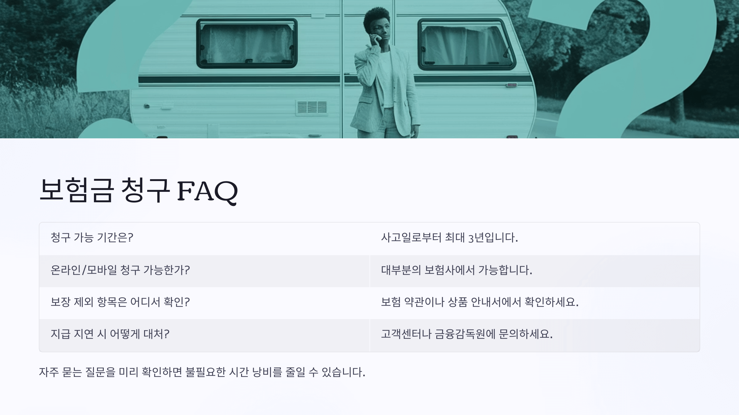 ๋ณดํ—˜์‚ฌ๋งˆ๋‹ค ๋ณดํ—˜๊ธˆ ์ฒญ๊ตฌ ๋ฐฉ์‹๊ณผ ์ฒ˜๋ฆฌ ์†๋„, ์„œ๋น„์Šค ๋งŒ์กฑ๋„๋Š” ์ œ๊ฐ๊ฐ์ด์—์š”. ํŠนํžˆ ์บ ํ•‘์นด์ฒ˜๋Ÿผ ์ผ๋ฐ˜ ์ฐจ๋Ÿ‰๊ณผ ๋‹ค๋ฅธ ์š”์†Œ๊ฐ€ ๋งŽ์€ ๊ฒฝ์šฐ์—๋Š” ๋ณดํ—˜์‚ฌ๋ณ„ ๋Œ€์‘ ํƒœ๋„ ์ฐจ์ด๊ฐ€ ๋” ๋šœ๋ ทํ•˜๊ฒŒ ๋‚˜ํƒ€๋‚˜์š”. ๊ทธ๋ž˜์„œ ๊ฐ€์ž… ์ „ ๋น„๊ต๊ฐ€ ์•„์ฃผ ์ค‘์š”ํ•˜๋‹ต๋‹ˆ๋‹ค.